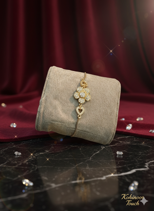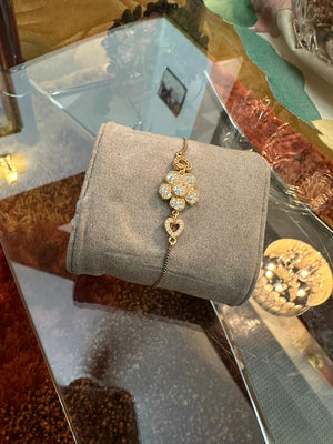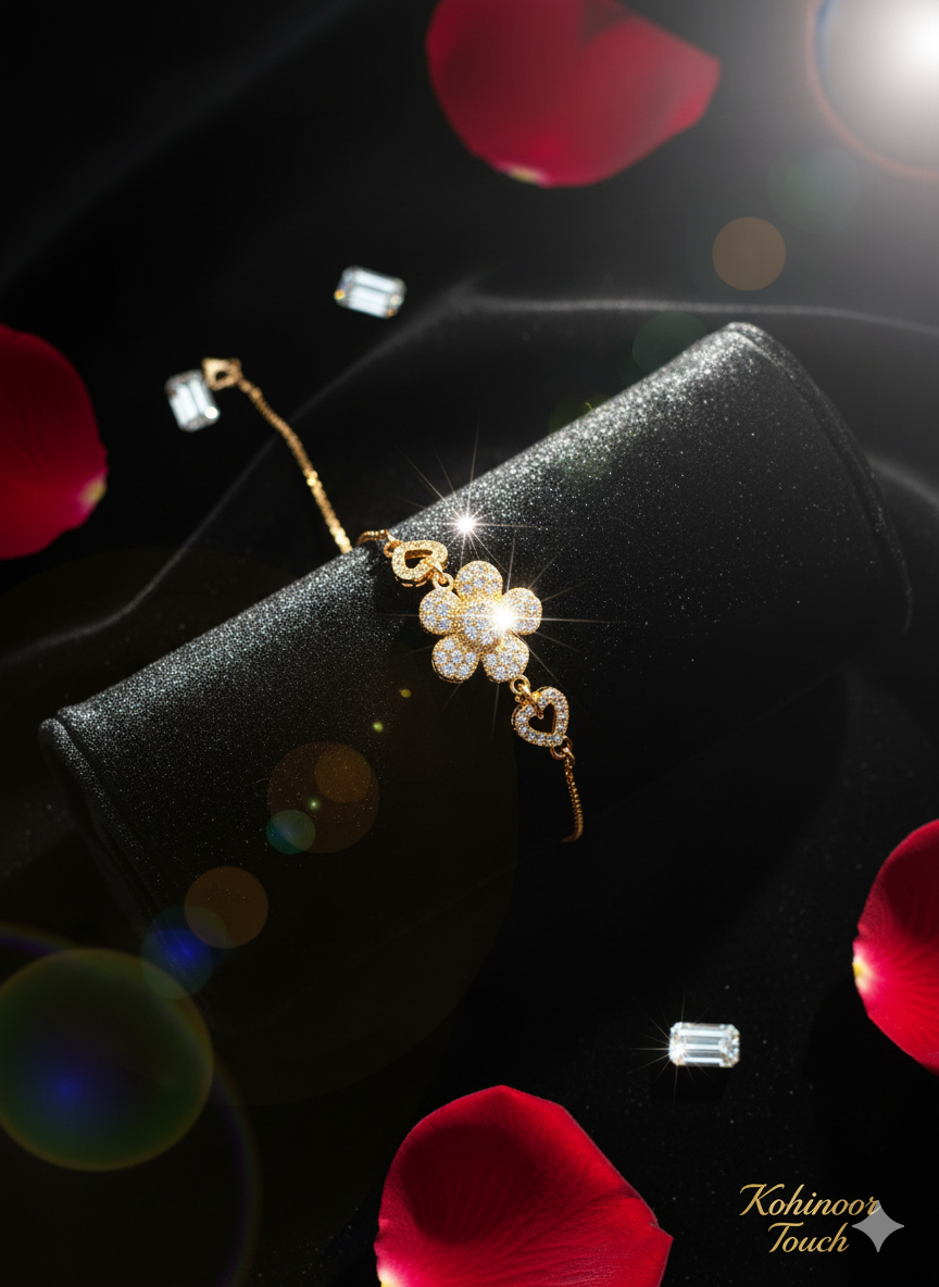 Adorn your wrist with timeless elegance. This exquisite bracelet features a dazzling, pavé-set diamond flower, symbolizing beauty and growth, gracefully paired with a delicate diamond heart, representing everlasting love. Crafted in lustrous gold, it's a perfect gift to cherish or a sparkling addition to any ensemble.