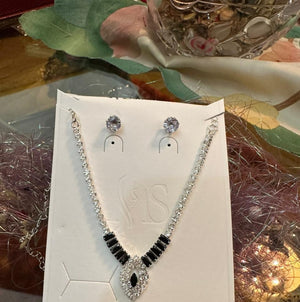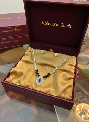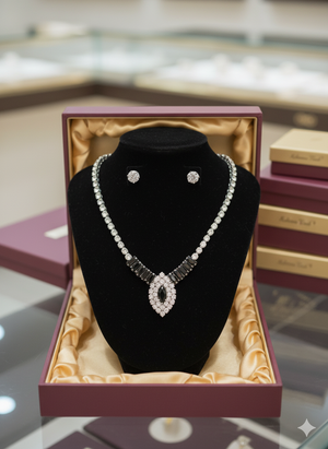Discover a symphony of dazzling brilliance and profound elegance with our Ebony & Ivory Grandeur Set. This exquisite silver-toned necklace features a captivating design where brilliant white simulated diamonds gracefully frame bold, rectangular black stones, leading to a mesmerizing central marquise-cut black gem, encircled by a halo of sparkle. The perfectly matched solitaire stud earrings complete this distinguished ensemble. Presented in our signature 'Kohinoor Touch' velvet box, this set is a celebration of contrasting beauty, perfect for grand Pakistani occasions, formal wear, or as a treasured heirloom.