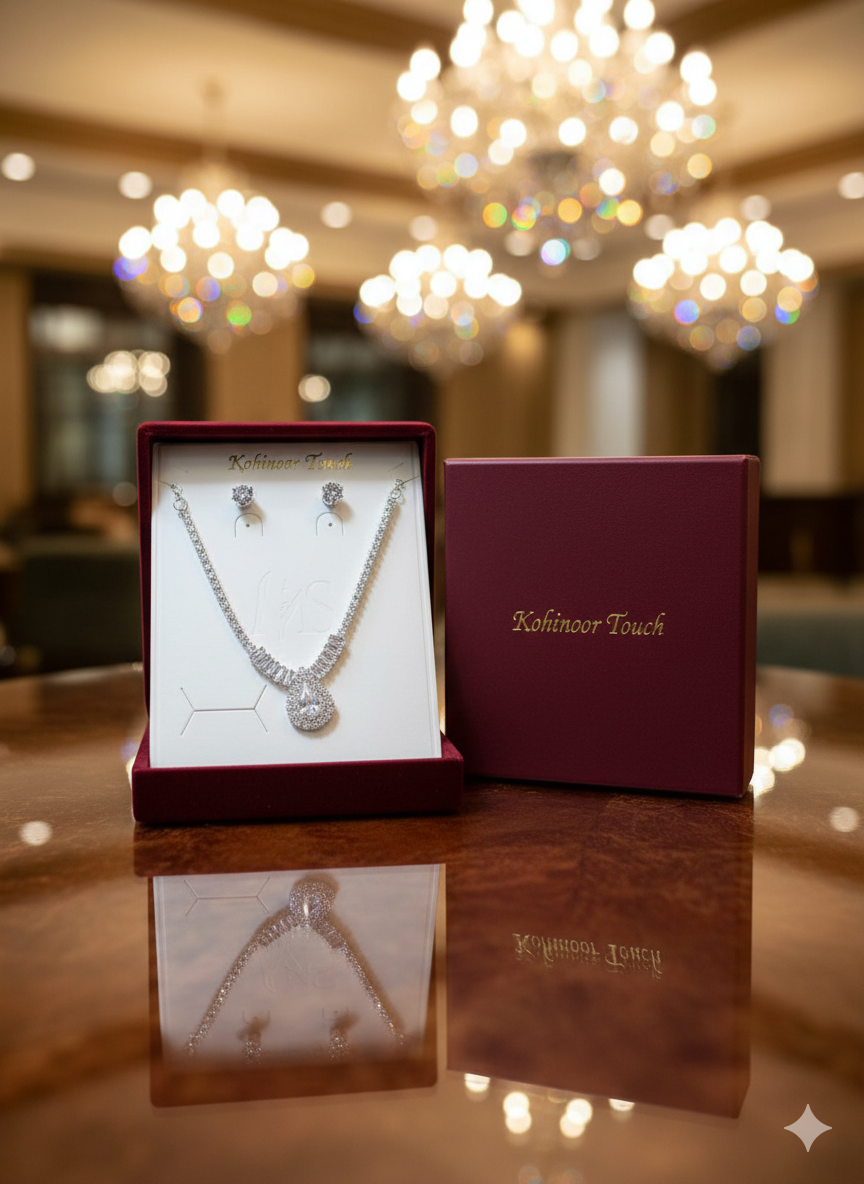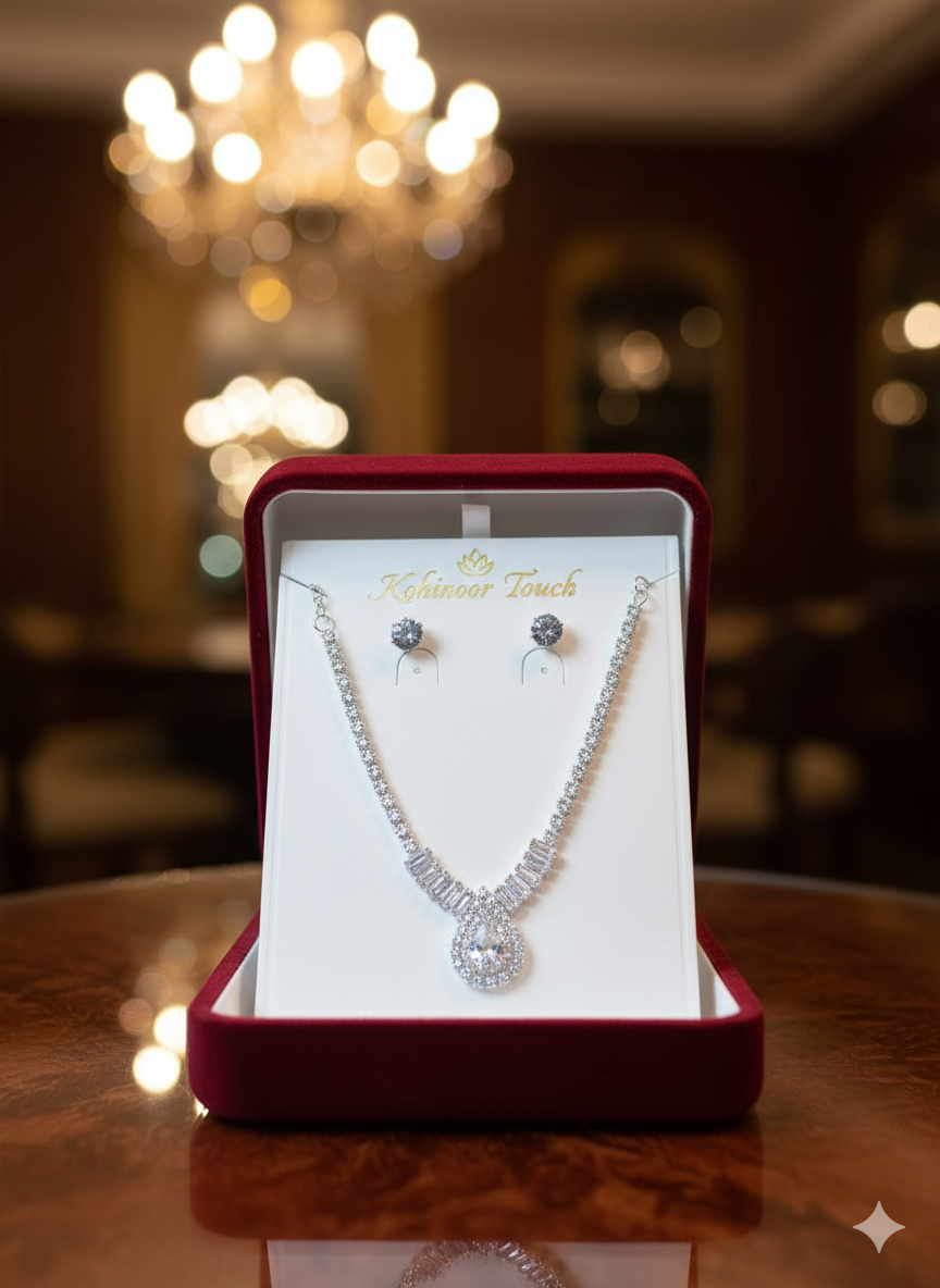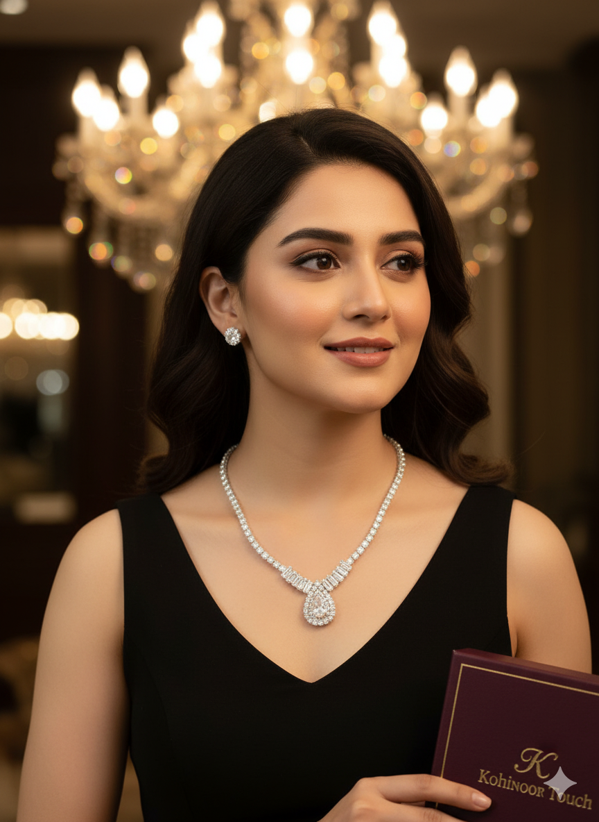 Command attention with the magnificent Emerald Empress Choker Set. This breathtaking silver-toned ensemble features an intricately designed choker necklace, meticulously adorned with shimmering simulated diamonds and stunning emerald green accents, culminating in a graceful drop pendant. The matching earrings perfectly echo the opulent design, creating a look of unparalleled sophistication. A true masterpiece inspired by traditional Pakistani grandeur, this set is ideal for weddings, formal galas, or any occasion where you wish to embody regal elegance and vibrant charm