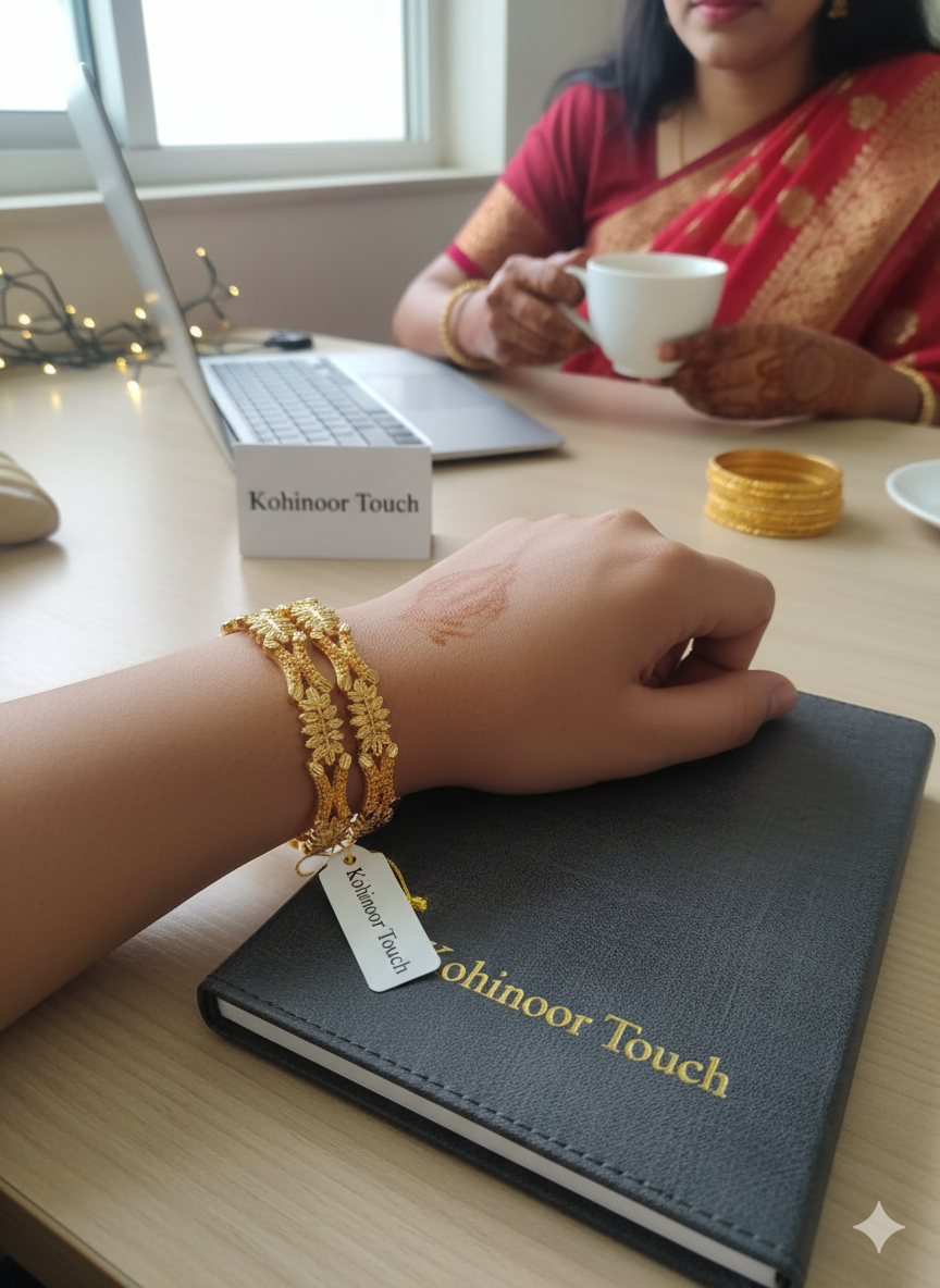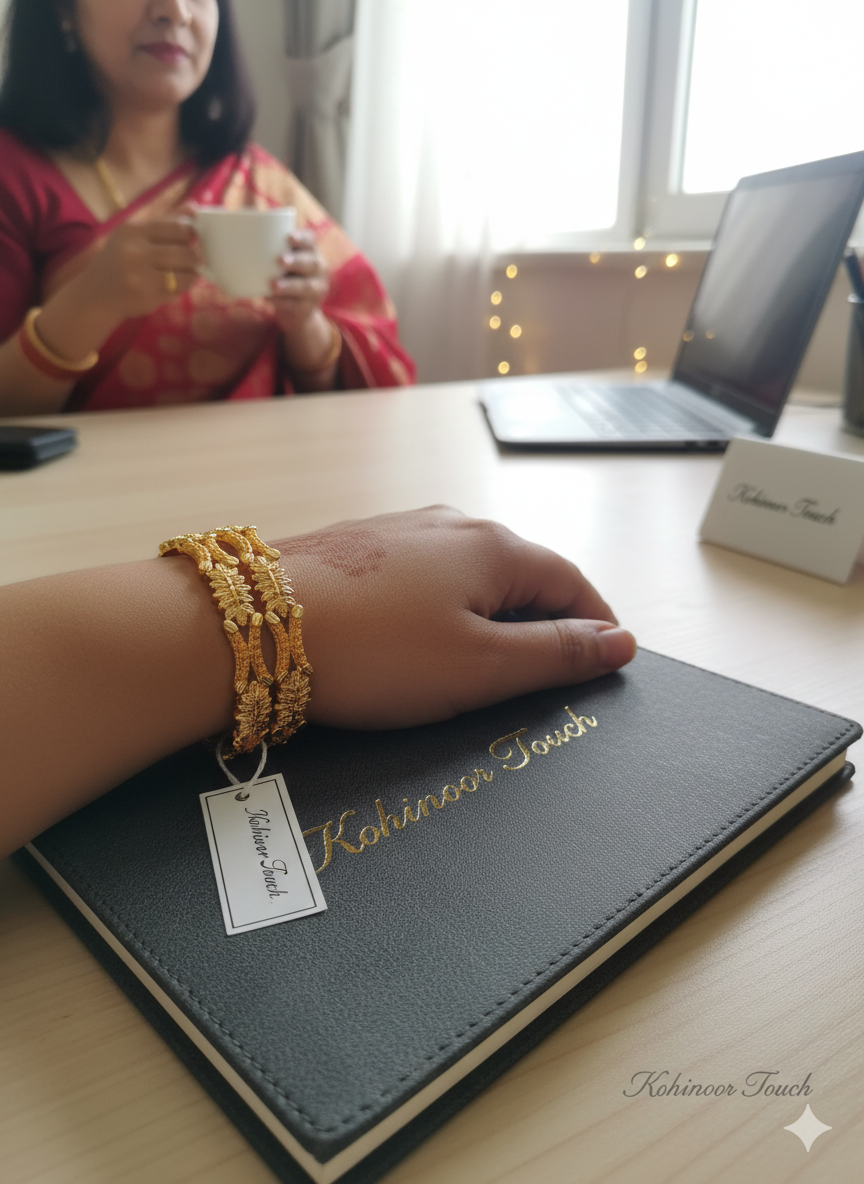 Adorn your wrists with the timeless elegance of our Vrindavan Vine Bangles. Inspired by lush botanical motifs, these exquisite gold-toned bangles feature intricately sculpted leaves and delicate flourishes, evoking the beauty of a blooming garden. Perfect for celebratory occasions or adding a touch of classic Indian charm to any ensemble.
