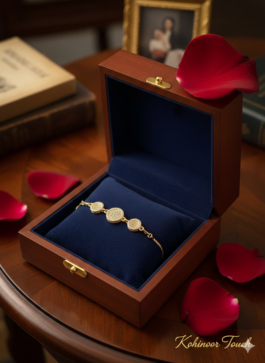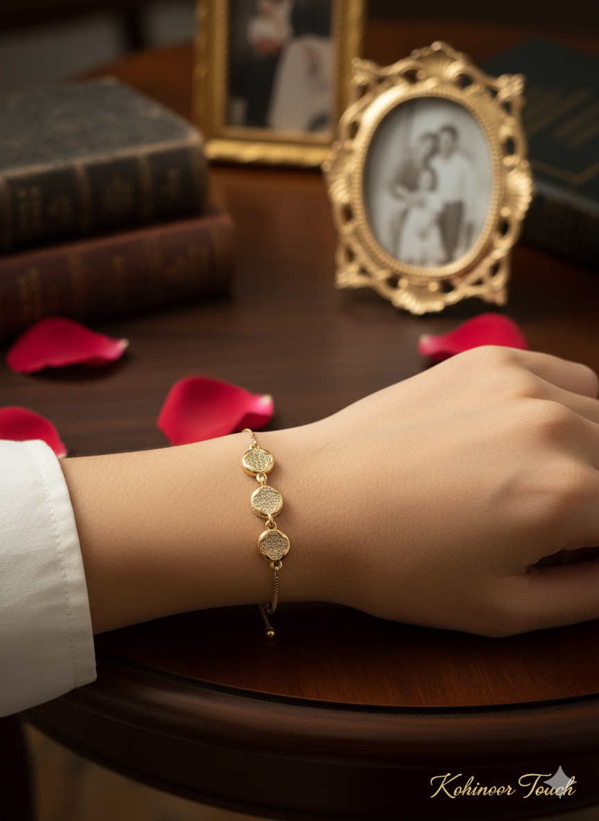 Adorn your wrist with the captivating Golden Orbit Bracelet. This exquisite piece features three meticulously crafted, gold-toned circular charms, each showcasing a shimmering pavé or textured surface that beautifully reflects light. Delicately linked by a fine chain, these "orbiting" charms create a sophisticated and harmonious design. Perfect for layering or wearing on its own, this bracelet adds a touch of radiant elegance to any ensemble, from casual chic to evening glamour