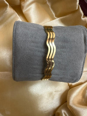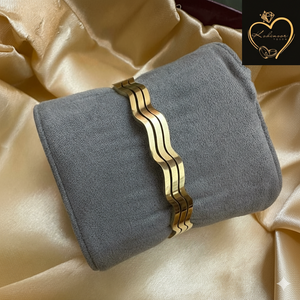 Discover understated beauty with the Golden Ripple Bangle. Its unique wavy design offers a modern twist on classic gold jewelry, making it an effortlessly chic accessory for everyday wear or special occasions. Designed for secure wear, this elegant bangle features a reliable lockable mechanism.