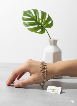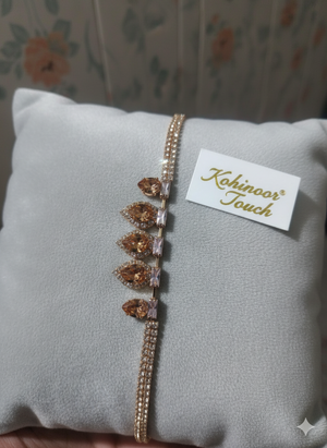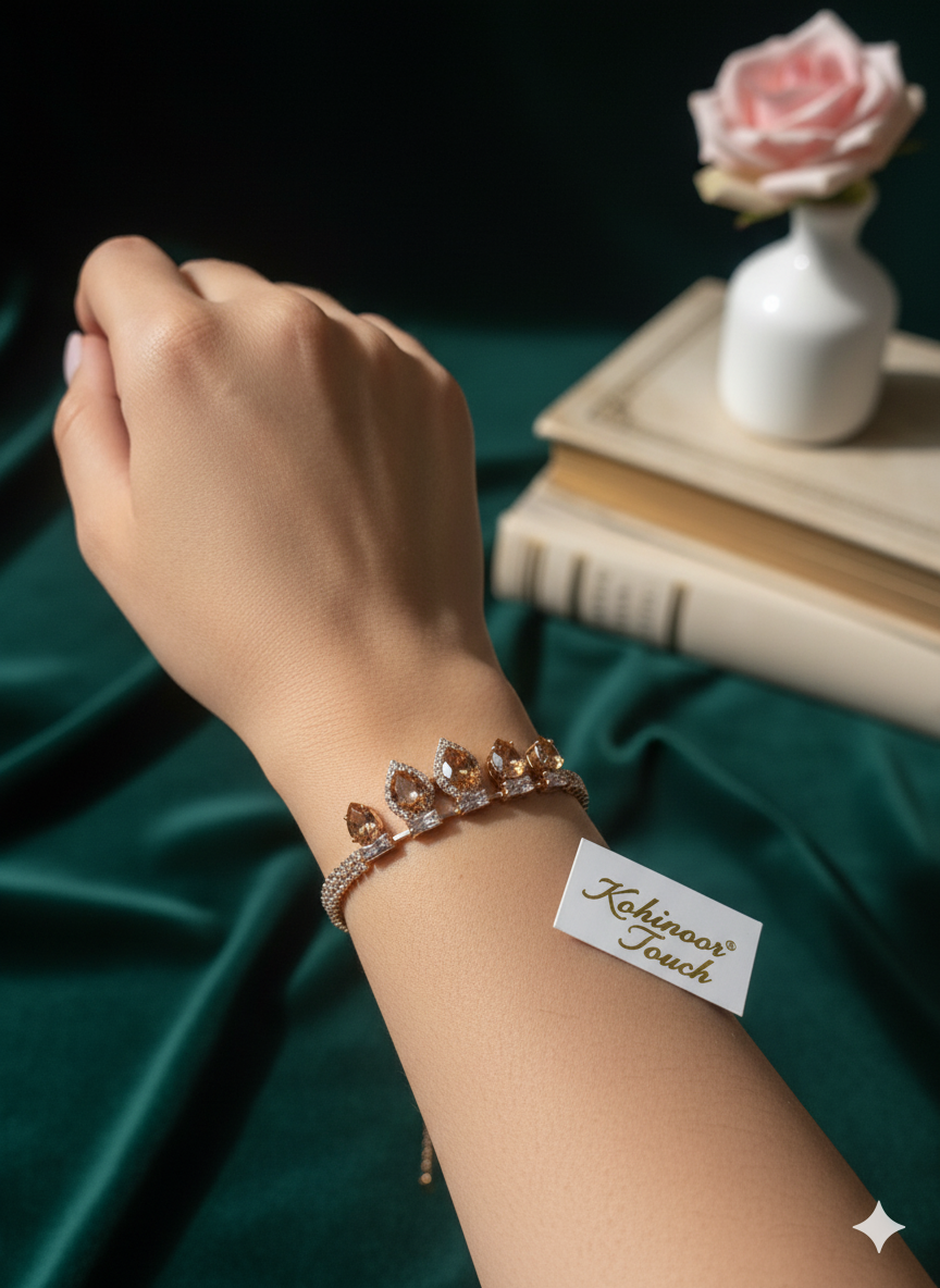 Infuse your look with radiant warmth with the Golden Teardrop Statement Bracelet. Featuring captivating golden-hued teardrop and marquise crystals, beautifully contrasted by sparkling clear accents, this bracelet is a masterpiece of design. The dual rose gold-toned bands create a bold yet elegant silhouette, perfect for making a memorable impression