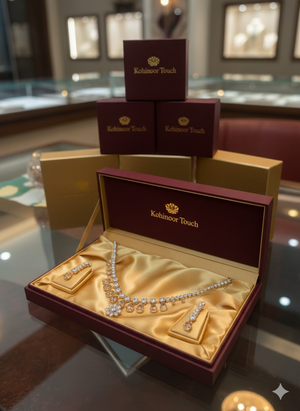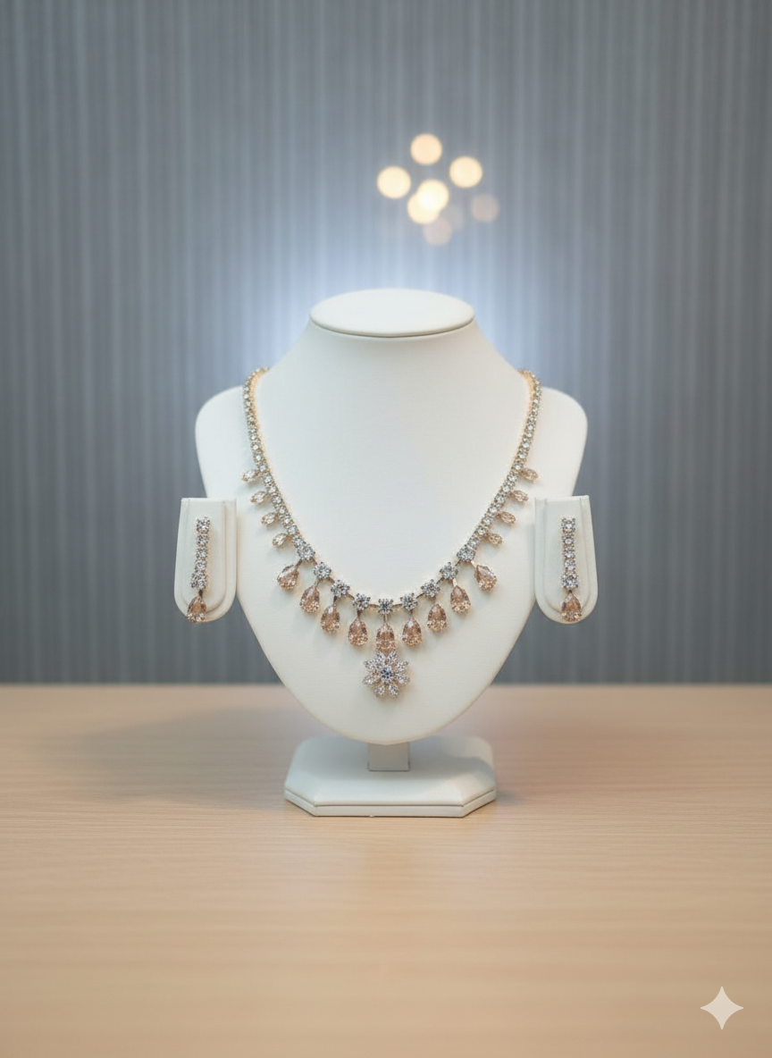 Dazzle with graceful elegance in our captivating Gulabi Shabnam Sparkle set. This beautiful rose gold-plated necklace features a sparkling chain leading to a breathtaking arrangement of brilliant white and warm, pear-shaped accent stones that gently catch the light, culminating in a charming flower-inspired pendant. The delicate drop earrings provide the perfect finishing touch. Versatile and elegant, this set is perfect for adding a touch of refined sparkle to both traditional and contemporary Pakistani outfits, making every moment feel special.