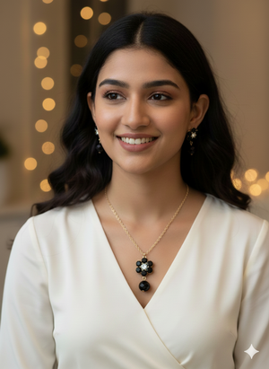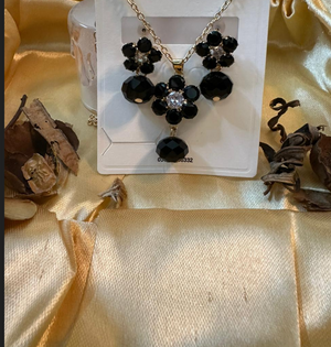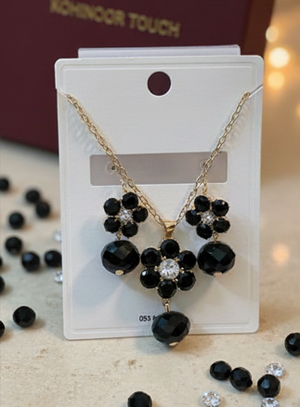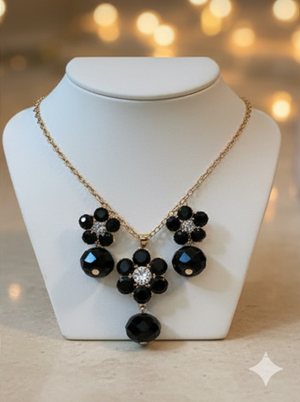 Command attention with our 'Midnight Bloom Statement Set,' a captivating ensemble designed for audacious elegance. This stunning set features a necklace and matching earrings, each adorned with a dramatic black beaded flower motif, centered by a brilliant clear crystal. The rich contrast of deep black against sparkling crystal, set in a radiant gold-tone finish, creates a truly unforgettable look. Perfect for making a powerful statement at any sophisticated event.