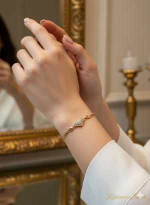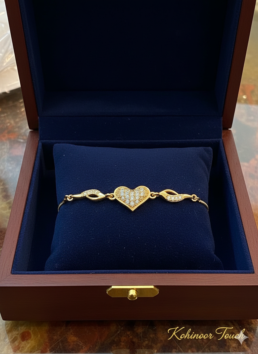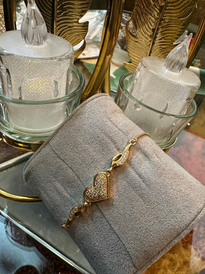 t's a delicate gold-toned bracelet featuring a prominent heart-shaped charm at its center. The heart is adorned with numerous small, sparkling clear stones, likely rhinestones or cubic zirconia, giving it a pavé effect. On either side of the heart, the bracelet's chain transitions into two interconnected, wavy, elongated links, also embellished with the same type of clear stones. The rest of the bracelet appears to be a fine chain, suggesting an elegant and understated design.