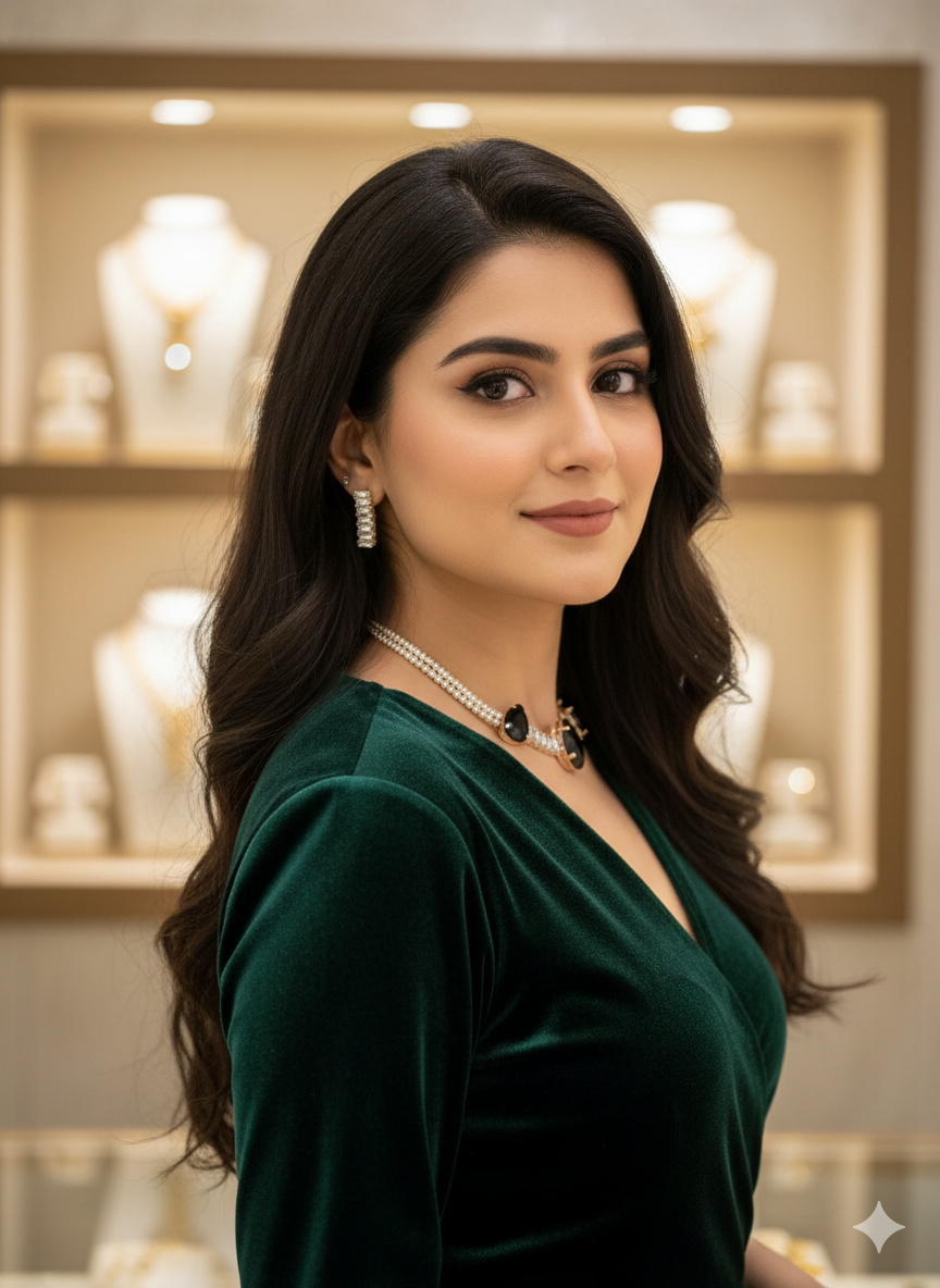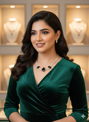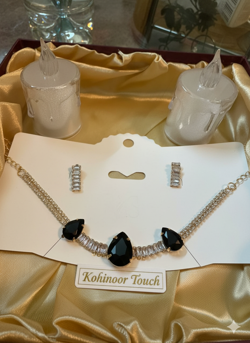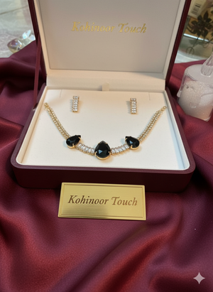 Introducing the exquisite Shab-e-Gham Necklace Set from Kohinoor Touch, a masterpiece that beautifully blends classic sophistication with contemporary Pakistani elegance. This captivating ensemble features lustrous black gemstones, meticulously set against brilliant golden tones and sparkling white accents, creating a dramatic and luxurious contrast.