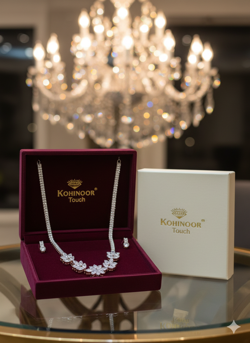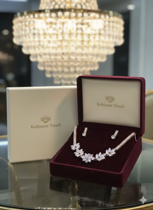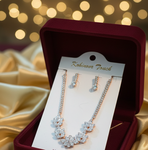 Unveil timeless beauty with our exquisite Velvet Bloom Set. Nestled within a plush, rich velvet box, this stunning jewelry ensemble features a gracefully designed necklace where brilliant marquise-cut simulated diamonds blossom into captivating floral motifs. Complementing this, the delicate drop earrings add a perfect touch of radiant sparkle. Finished in a luxurious rose gold tone, this set is a truly magnificent gift, perfect for celebrating life's most cherished moments, from grand Pakistani weddings to intimate festive gatherings.