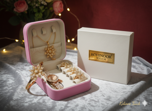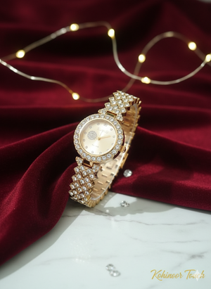 This dazzling Kohinoor Touch collection features a radiant array of gold-toned jewelry, intricately embellished with brilliant clear crystals. The centerpiece is a stunning watch with a circular, crystal-encrusted bezel and a luxurious, crystal-studded band.