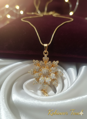 A delicate necklace with a prominent, sparkling snowflake pendant.