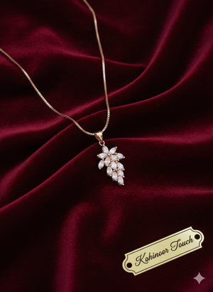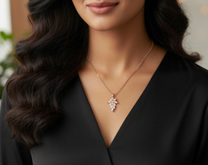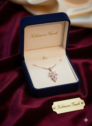 Embrace the delicate beauty of nature with our 'Whispering Leaf Diamond Necklace.' This enchanting piece features a graceful cluster of brilliant pavé-set diamonds, forming an elegant leaf-like silhouette that shimmers with life. Crafted in radiant rose gold, it adds a touch of organic elegance and timeless sparkle to any look. Presented in a luxurious 'Kohinoor Touch' box, it's a perfect gift to cherish or a treasured addition to your collection.